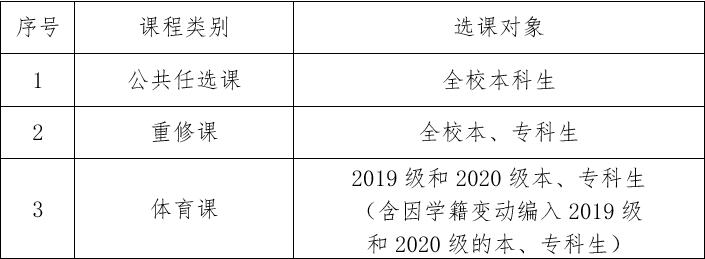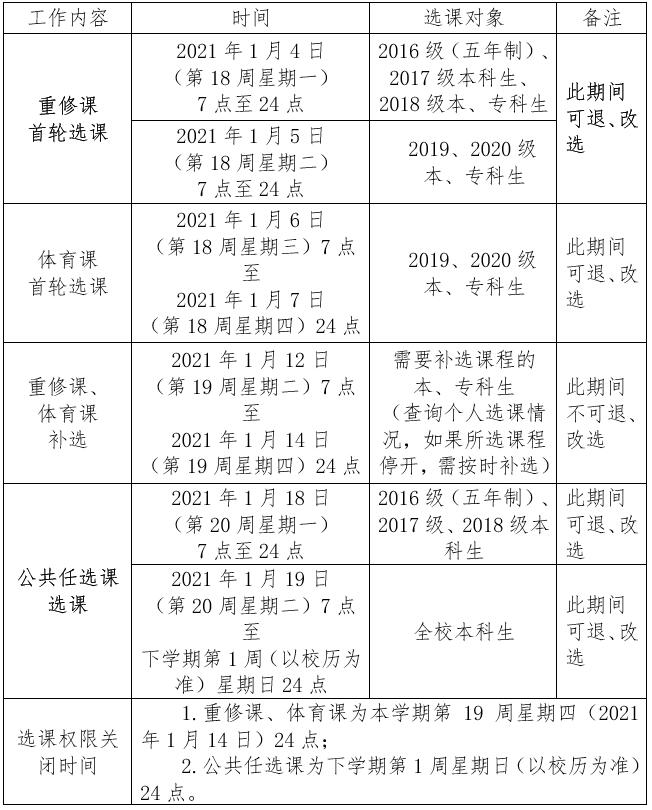 2020-2021学年第二学期体育课、重修课及公共任选课网上选课将于2021年1月4日(第18周星期一)早上7点开始,现将相关事项通知如下: