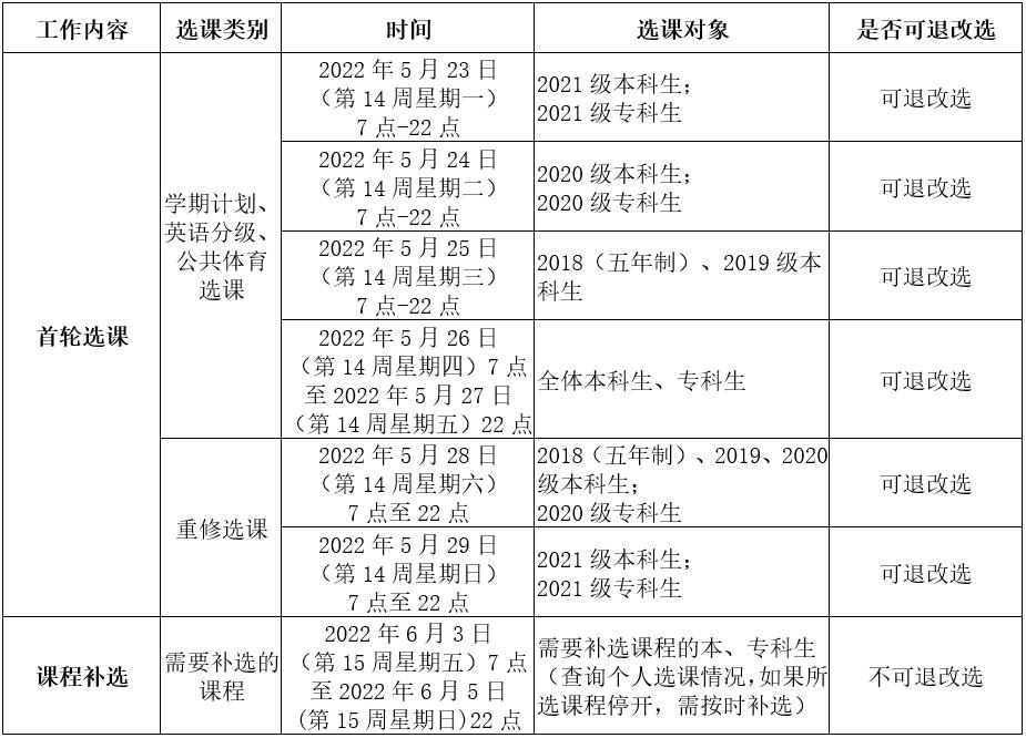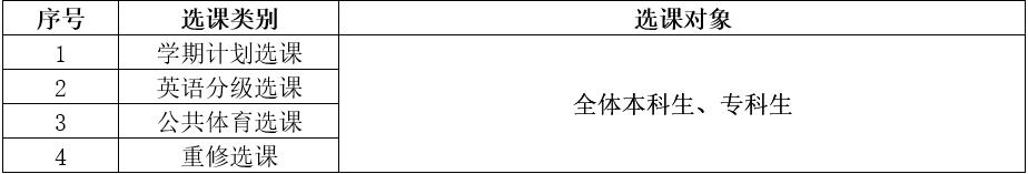 各学院: 2022-2023学年第一学期课程选课将于2022年5月23日(第14周星期一)早上7点开始,现将选课相关事项通知如下。 一、选课类别及选课对象