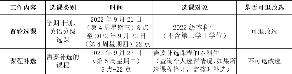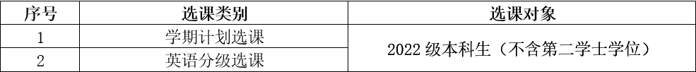 各学院: 2022-2023学年第二学期2022级本科生课程选课将于2022年9月21日(第4周星期三)早上8点开始,现将选课相关事项通知如下。 一、选课类别及选课对象
