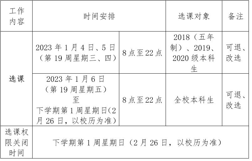 各学院: 2022-2023学年第二学期本科生公共任选课网上选课将于2023年1月4日(第19周星期三)早上8点开始,现将相关事项通知如下。 一、选课时间安排