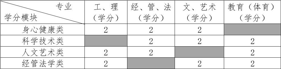 二、选课要求 公共任选课分为身心健康类、科学技术类、人文艺术类、经管法四个模块(见下表)。学生在校期间,应根据相应培养方案,修满其所在专业需覆盖的3个模块(每个模块2学分),总计6学分课程。我校各专业需覆盖的公选课学分模块见下表: 各专业公共任选课学分模块
