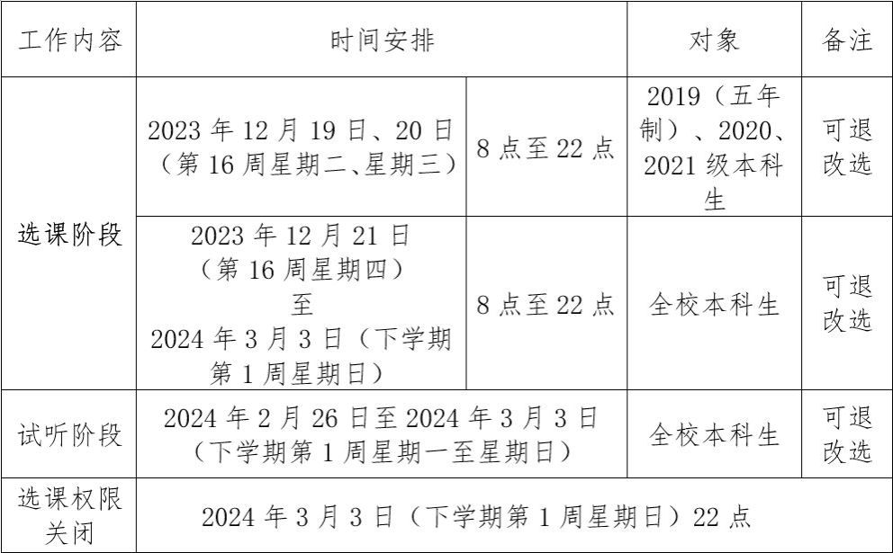 各学院: 2023-2024学年第二学期本科生公共任选课网上选课将于2023年12月19日(第16周星期二)早上8点开始,现将相关事项通知如下: 一、选课时间安排