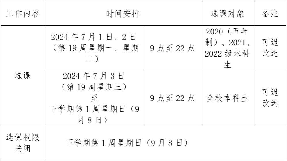 各学院: 2024-2025学年第一学期本科生公共任选课网上选课将于2024年7月1日(第19周星期一)早上9点开始,现将相关事项通知如下: 一、选课时间安排