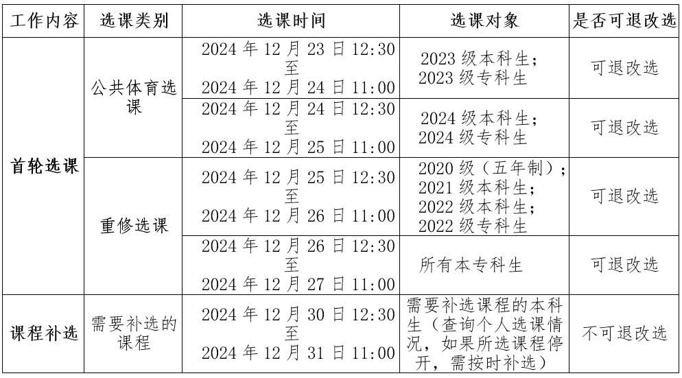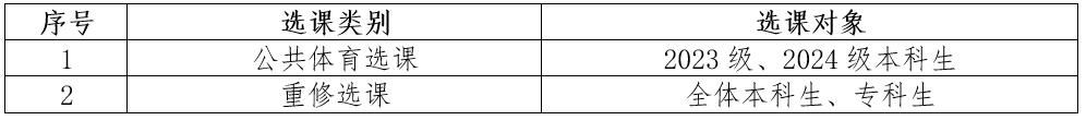 各学院: 2024-2025学年第二学期本、专科生公共体育及重修课程选课将于2024年12月23日(第17周星期一)中午12:30开始,现将选课相关事项通知如下。 一、选课类别及选课对象