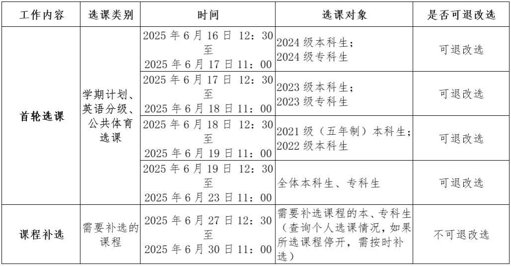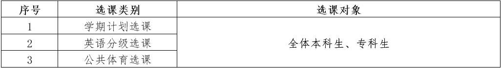 各学院: 本、专科生2025-2026学年第一学期课程选课将于2025年6月16日(第17周星期一)中午12:30开始,现将选课相关事项通知如下: 一、选课类别及选课对