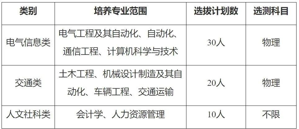 你是否渴望在求知路上邂逅更辽阔的天地?是否想让大学时光成为点燃未来的火种?“天佑学子培育计划” 正为你敞开一扇通往卓越的大门,这里为你准备了动态成长的舞台,不必困于专业壁垒,可自由奔赴热爱的领域,60个席位,是60个与卓越同行的机会,快来查看选拔通知,开启新的挑战! 一、选拔对象 华东交通大学2025年录取的高考成绩排名前列,或学科特长和创新潜质突出、综合素质特别优秀的全日制本科新生,其中电气信息类和交通类考生的高考选测科目须含物理。录取前与学校有明确约定的定向培养学生以及有明确规定不能转专业的学生除外。 二、选拔方式 采取高考录取后校内二次选拔方式进行,通过面试、综合测试相结合,以综合评价排名的方式择优选拔。通过选拔的学生入选“天佑学子培育计划”,编入2025级“天佑学子”班,单独培养,在南区学24栋天佑学院统一住宿。 三、选拔计划