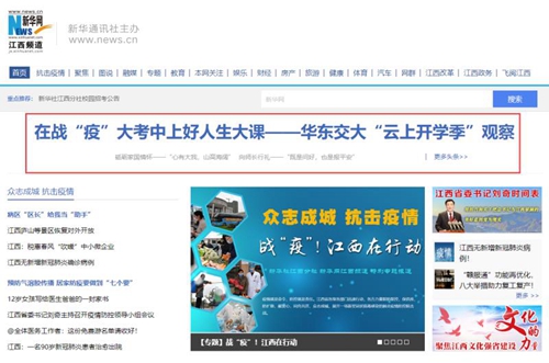 图为《在战“疫”大考中上好人生大课——华东交大“云上开学季”观察》长篇通讯登上新华网首页大头条。