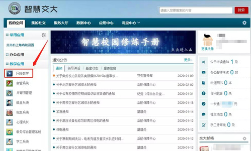用户进入“智慧交大”,点击左侧“教学应用”-“网络教学”,进入本人“学习空间”即可看到相应的课程。