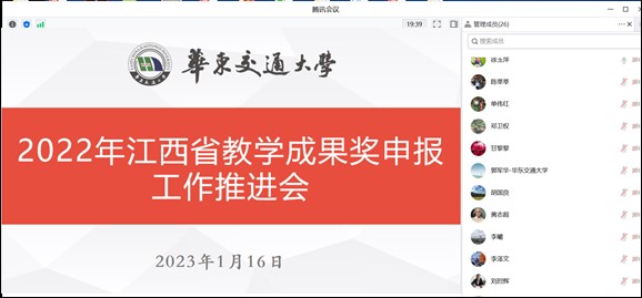 2023年1月16日,我校2022年江西省教学成果奖申报工作推进会在线上召开。教务处处长徐玉萍主持会议,校党委委员、副校长黄志超出席会议并做总结讲话,各学院院长和教学副院长参加了此次会议。